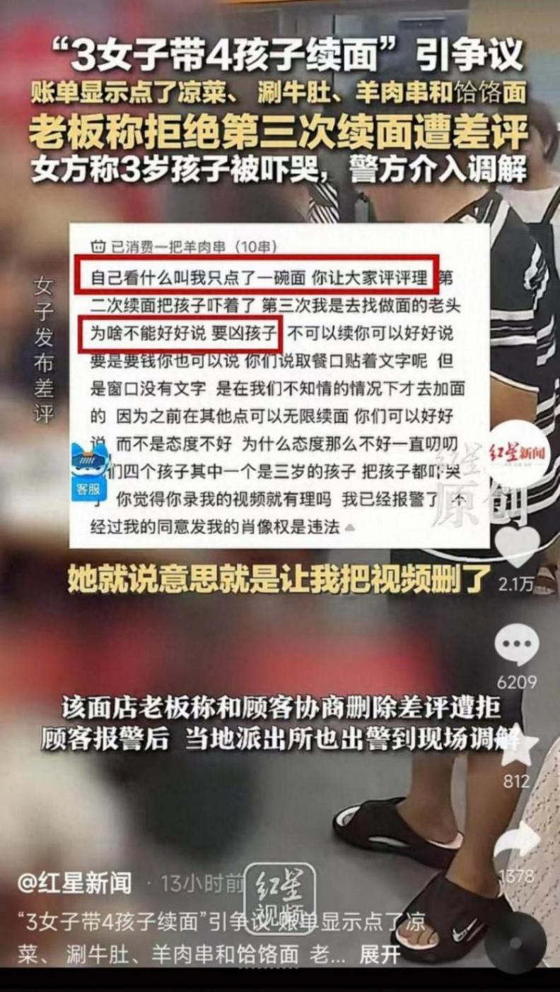 3个大人4个小孩到餐馆吃饭,连续多次续面,遭到店铺老板拒绝,最终消费者直接在团购平台连续发了2条差评,惹怒了老板连发多条监控视频公开事件经过。