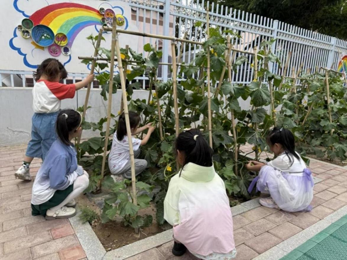 △金川区第三幼儿园的小朋友们正在采摘黄瓜