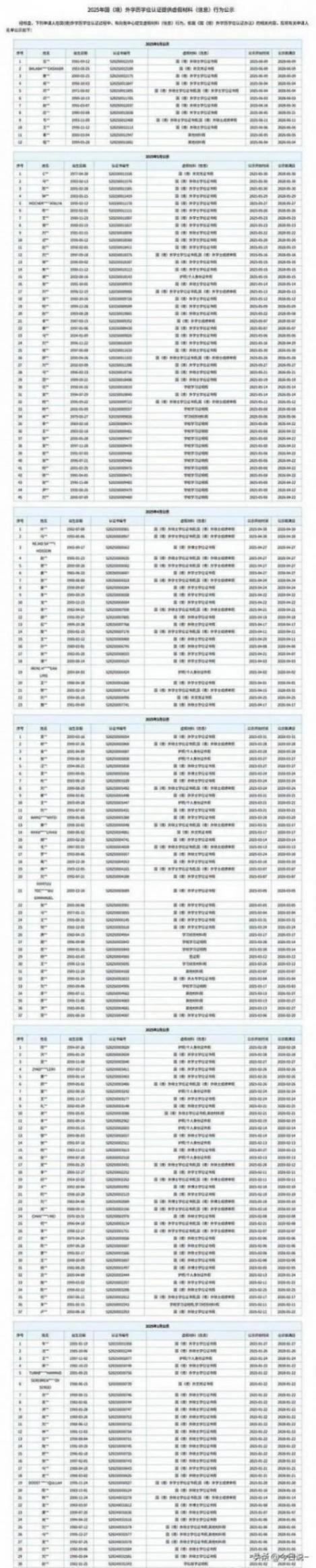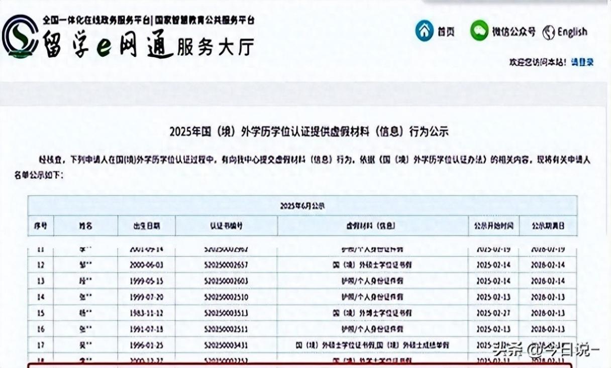 教育部留学服务中心官网发布2025年“国(境)外学历学位认证提供虚假材料(信息)行为”公示,71岁申请人邱某某因提交假博士证书、假成绩单被通报。