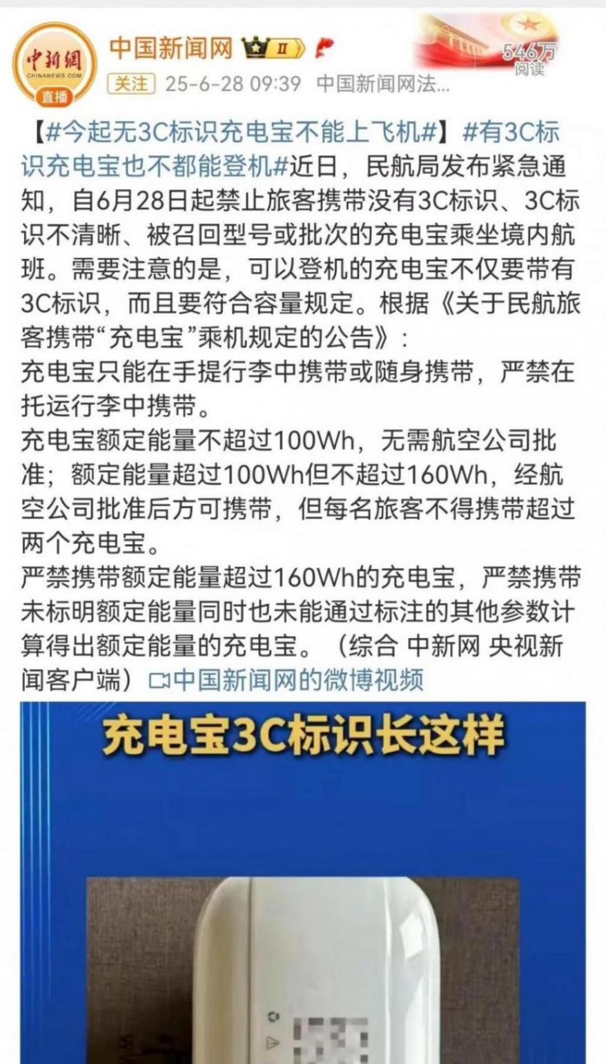 6月28日起,禁止旅客携带没有3C(中国强制性产品认证)标识、3C标志不清晰、已被召回型号或批次的充电宝乘坐境内航班。