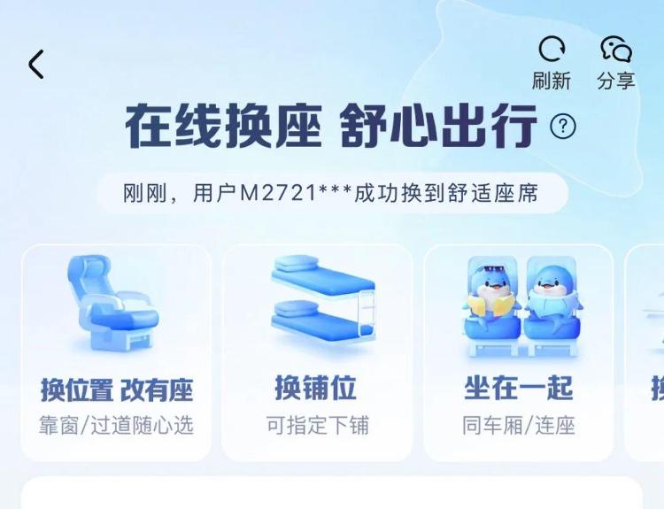 上述第三方平台客服表示,“在线换座”是指购票成功后,可通过“在线换座”功能去指定席位尝试改签,若换座失败,原车票仍可使用出行;若换座成功,原车票自动作废。客服还表示,改签中、已改签、已退票的电子客票订单,广深港车次、中老铁路订单,以及距离发车时间小于30分钟的订单暂不支持“在线换座”。
