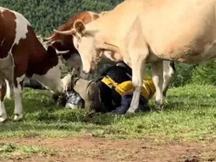 有些人真的是吃饱了闲的没事干,给牛喂牛肉干吃,差点被牛踩死,你说你好好的爬山就爬山吧,去招惹牛干什么。