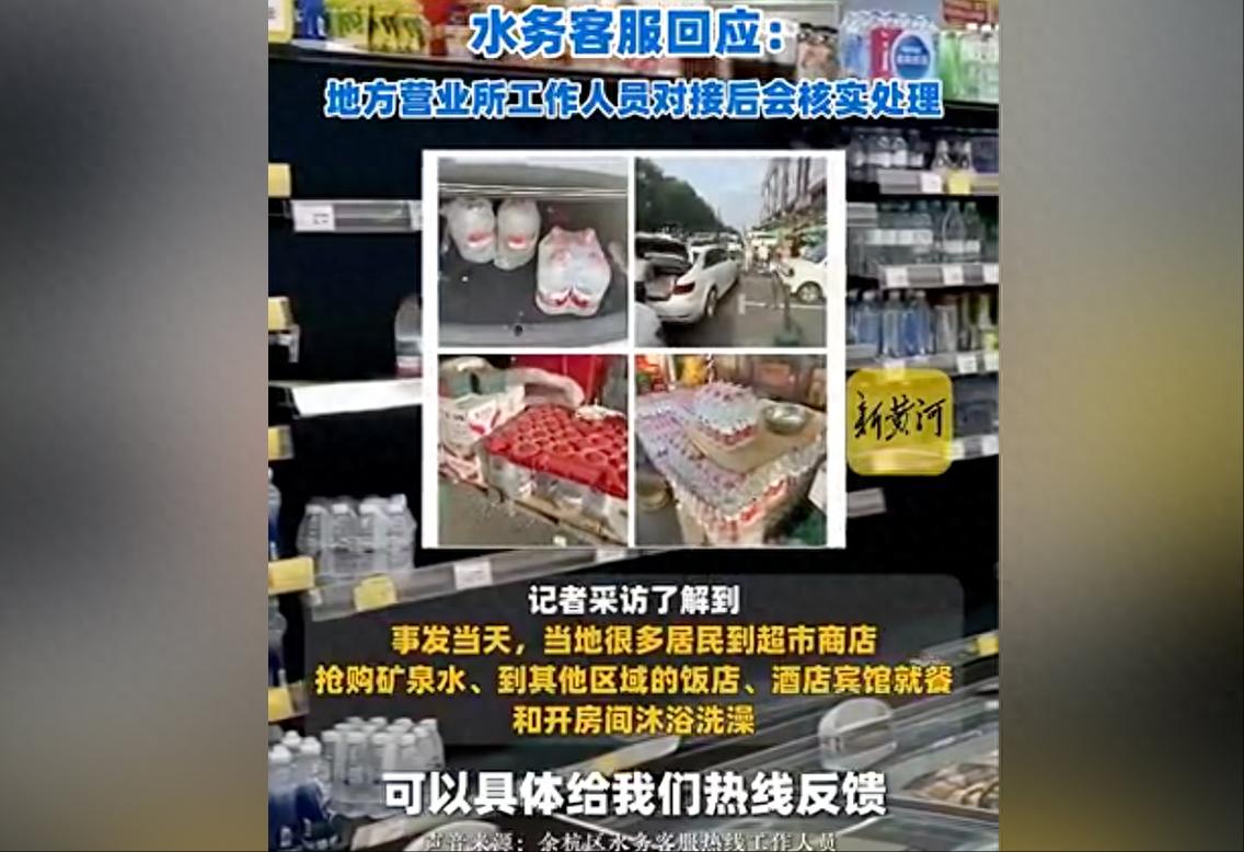 据新黄河记者采访了解,事发当天,当地很多居民到超市商店抢购矿泉水、到其他区域的饭店、酒店宾馆就餐和开房间沐浴洗澡。17日,有居民在网络上反映,喝了一天的水后腹泻严重,还有孕妇担心污水成分会不会对胎儿有影响。17日晚,杭州余杭水务客服热线向新黄河记者回应称,可以让相关居民给客服热线反馈说明自己地址和情况内容,热线这边会及时安排工单,然后,地方上营业所工作人员会跟客户对接进行核实和处理,“我这边的话只能帮您反馈问题,但是我也没有办法去跟您保证(能否赔偿)”。(新黄河)