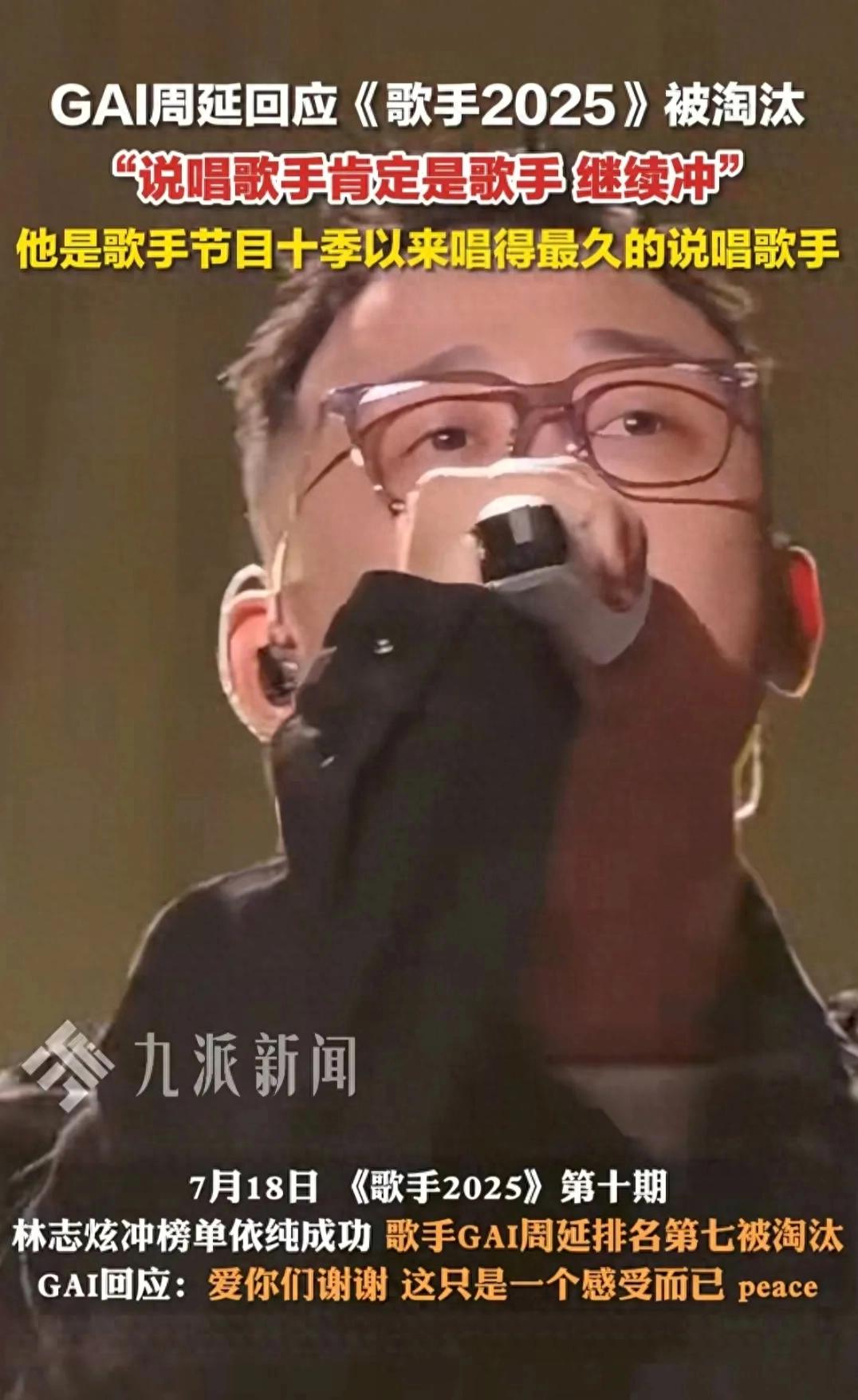 昨晚播出的《歌手2025》第十期竞演中,说唱天王GAI周延意外排名第七,遗憾止步舞台。面对淘汰结果,GAI洒脱表示:“不要太在乎输赢,我爱你们!”尽显音乐人的豁达与真诚。