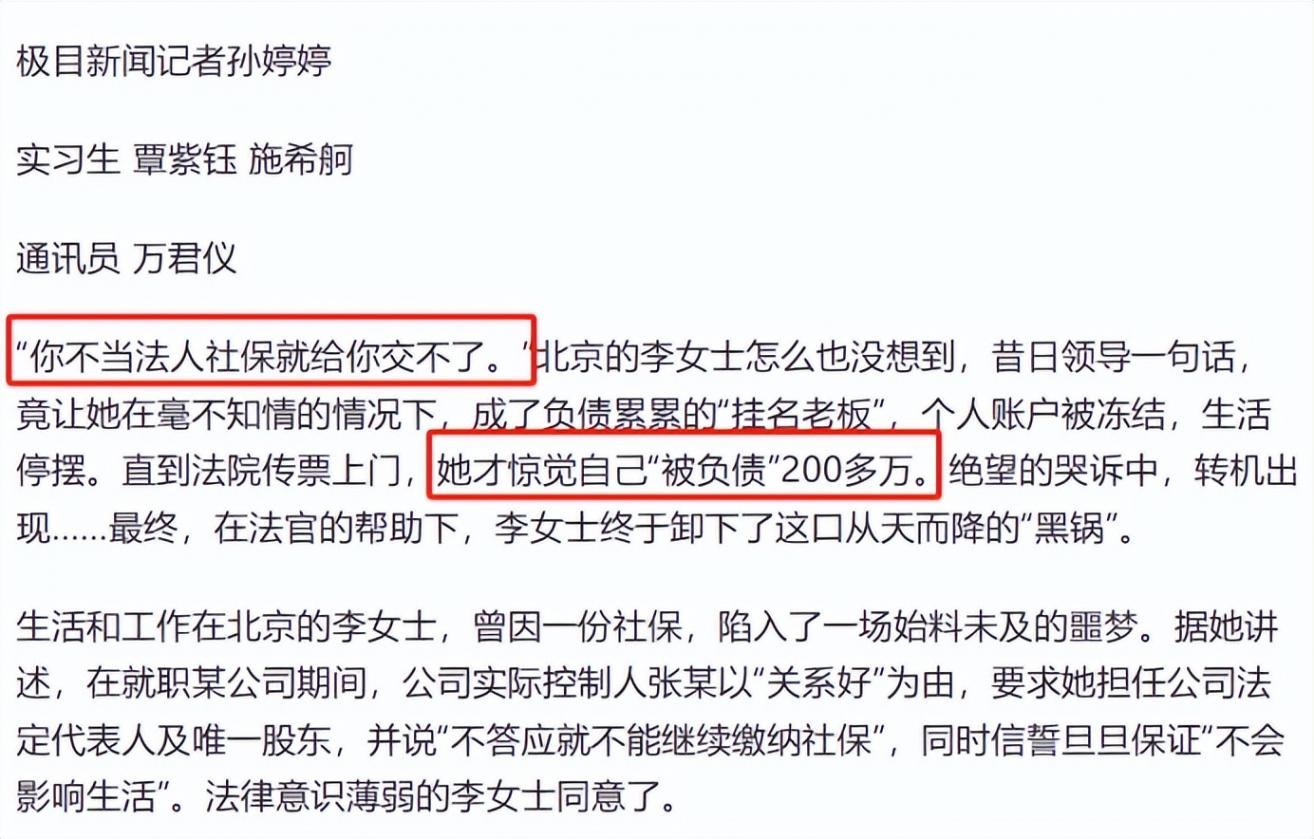 北京的李女士,入职公司之后,老板想要让她“当法人”,让她挂名担任公司的法定代表人和唯一股东。