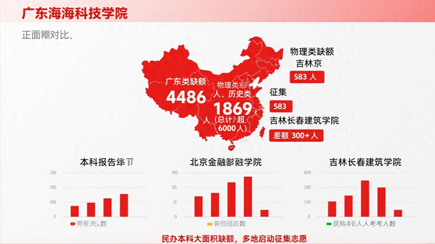 在广东省外,北京市和吉林省的志愿征集中,同样有不少民办高校急需大量征集生源。北京市发布的本科普通批征集计划显示,北京金融科技学院征集计划高达 583 人。据悉,这所高校除学费较为昂贵外,毕业生就业和升学情况实际上颇为可观。如今却出现大量征集的情况,极有可能是学生和家长对学费问题十分在意。吉林省发布的普通本科批征集计划中,除一些公办院校的冷门专业外,也存在大量民办本科征集计划。在物理组中,民办本科长春建筑学院、吉林建筑科技学院两所高校的差额均在 300 人以上 。