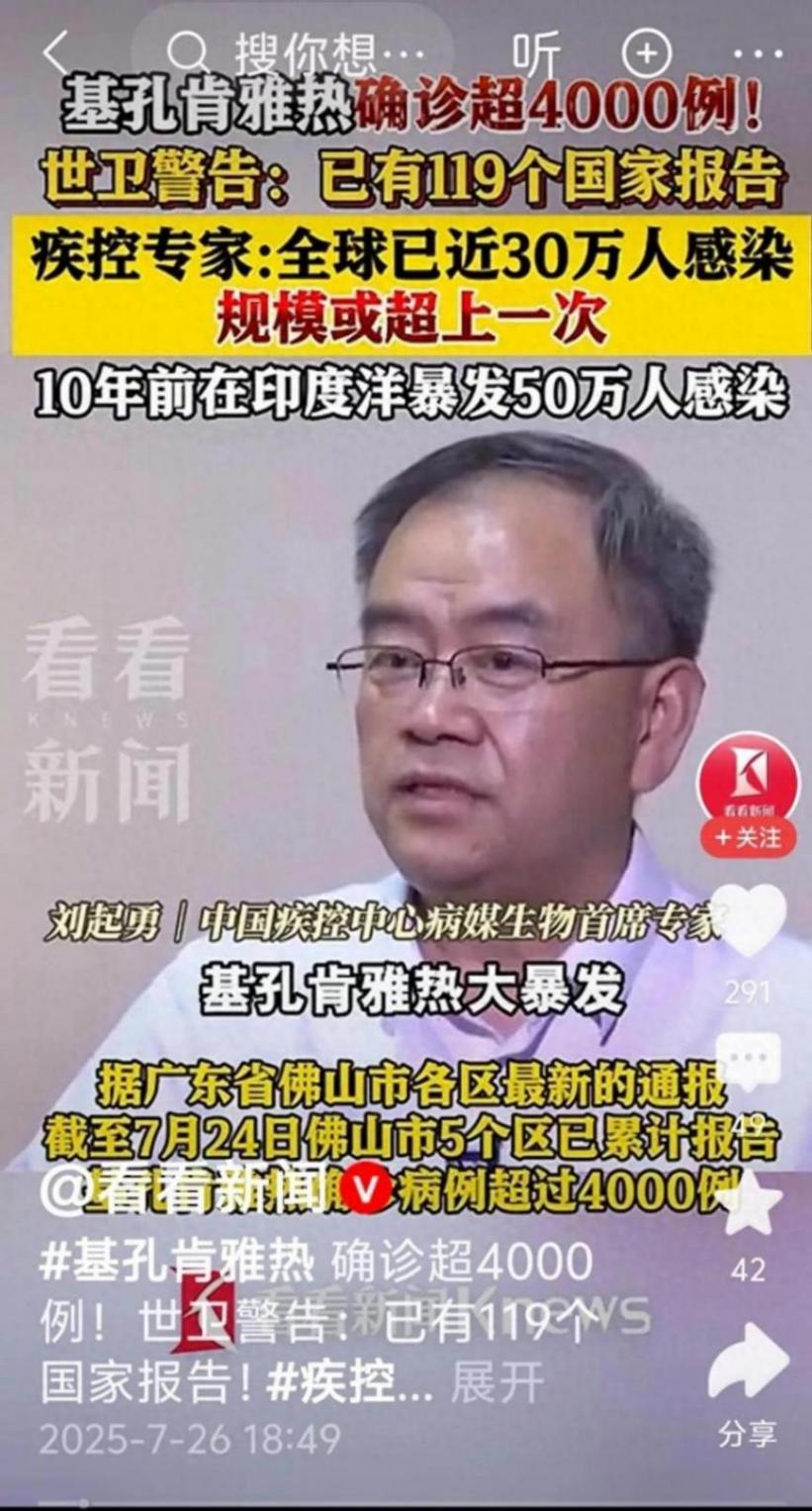 最近,一则消息如同一颗重磅炸弹,在广东佛山炸开了锅。截至7月24日,佛山5个区累计报告基孔肯雅热确诊病例超过4000例,其中顺德区更是高达3627例。与此同时,世界卫生组织(WHO)25日发出警告,基孔肯雅热病毒正在全球多地扩散,已有119个国家报告病例,约550万人面临感染风险。疾控专家也提醒,这场疫情规模可能超过10年前印度洋地区的大规模暴发。基孔肯雅热,这个名字听起来陌生又可怕的疾病,究竟是什么?它为何突然在全球范围内“兴风作浪”?我们又能做些什么?