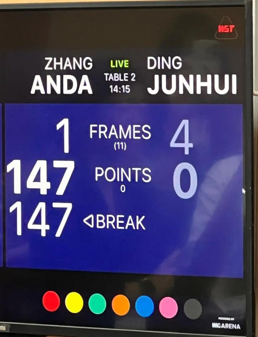 本场比赛第六局,张安达轰出单杆147分,这是他个人职业生涯的第四杆147分,也是本赛季的第二杆147分 。本赛季的第一杆147分是由另一位中国选手范争一打出的。