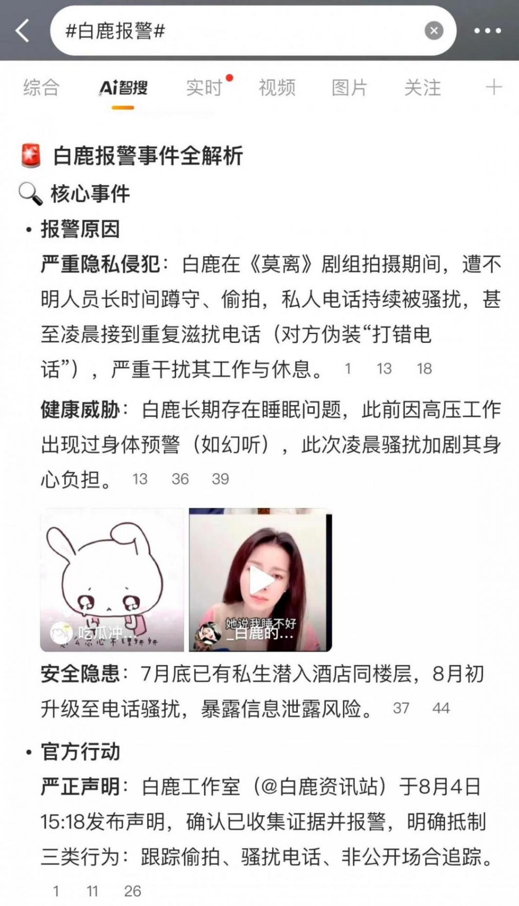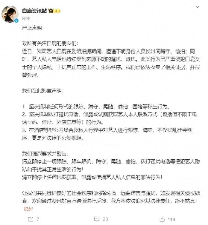 白鹿剧组拍戏期间,遭遇不明身份人员长时间蹲守、偷拍;并且电话也受到来源不明骚扰、滋扰。目前已经报警,并且郑重声明,抵制类似行为!麻烦大家给她一个好好拍戏的环境,作品见!