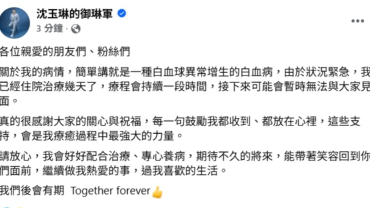 沈玉琳本人发声证实,6日晚上通过社交账号发文,承认患上白血球异常增生的白血病,情况紧急,已经住院治疗,会持续一段时间,感谢大家的祝福和关心,会好好配合治疗。