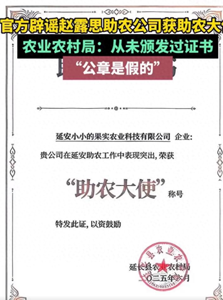 “赵露思助农”相关话题多次登上热搜,有网友发文质疑其团队“假助农”,称其助农卖苹果的店铺是自己人控股的公司开的。网传图片显示,多位赵露思粉丝发布的延安小小的果实农业科技有限公司曾被陕西省延长县农业农村局颁发“助农大使”称号,发证时间为2025年6月,证书称该公司在延安助农工作中表现突出。钱江视频联系到延长县农业农村局工作人员,他在电话中表示“我们从来不发这种证书”,随后他挂了电话,称需要与其他同事再核实。几分钟后,他在微信上给钱江视频记者发来了信息:“公章是假的!”(据8月13日钱江视频报道)