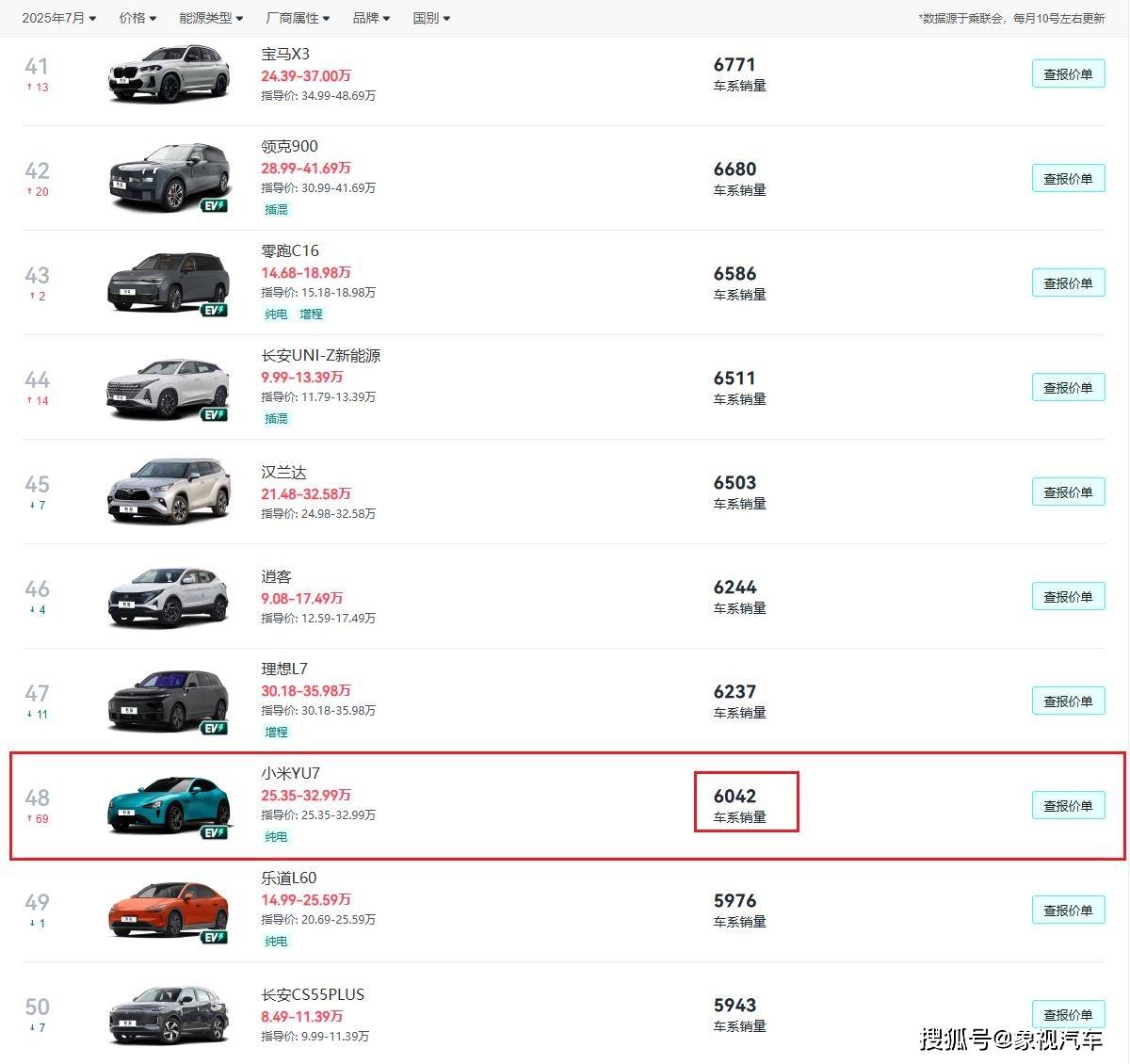 基于此,中国消费者很关心SUV车型的销量情况。7月SUV销量排行榜显示,Model Y以30766辆高居榜首,问界M8以21564位居第二。第三到第十名分别是博越、RAV4、宋PLUS新能源、星越L、途观L、卡罗拉锐放、理想L6、瑞虎8。前十名中外资和合资有四款车,国产车有六款,占据优势地位。令人意外的事,此前掀起滔天流量的小米YU7居然只有6042辆,差点挤不进前50,仅仅只排在第48位。