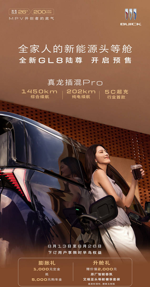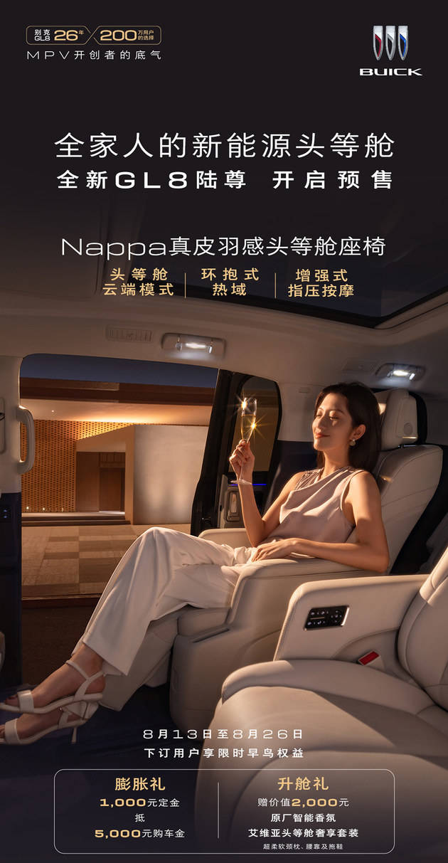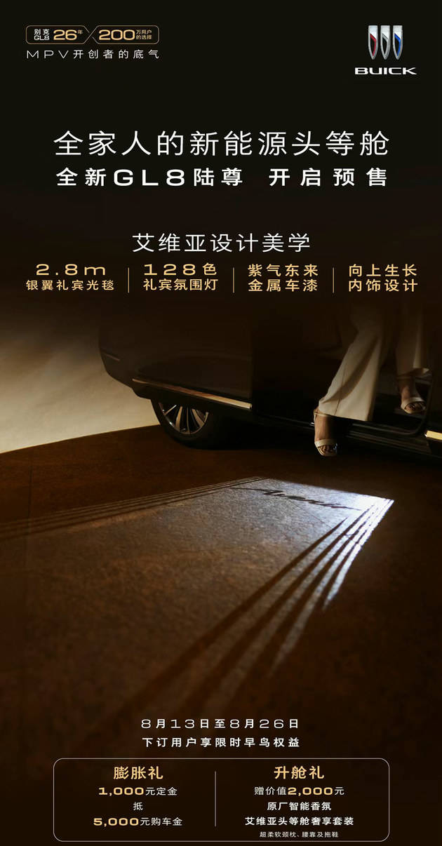 即日起,用户可通过别克官网、iBuick App、别克微信小程序或别克经销商店等渠道下单预订全新GL8陆尊,凡在8月13日-8月26日预售期间下订的用户,可享限时早鸟权益:膨胀礼1000元定金抵5000元购车金;价值2000元升舱礼,包含艾维亚头等舱奢享套装及原厂智能香氛。目前,全新GL8陆尊已经全面到达全国别克授权经销商门店。