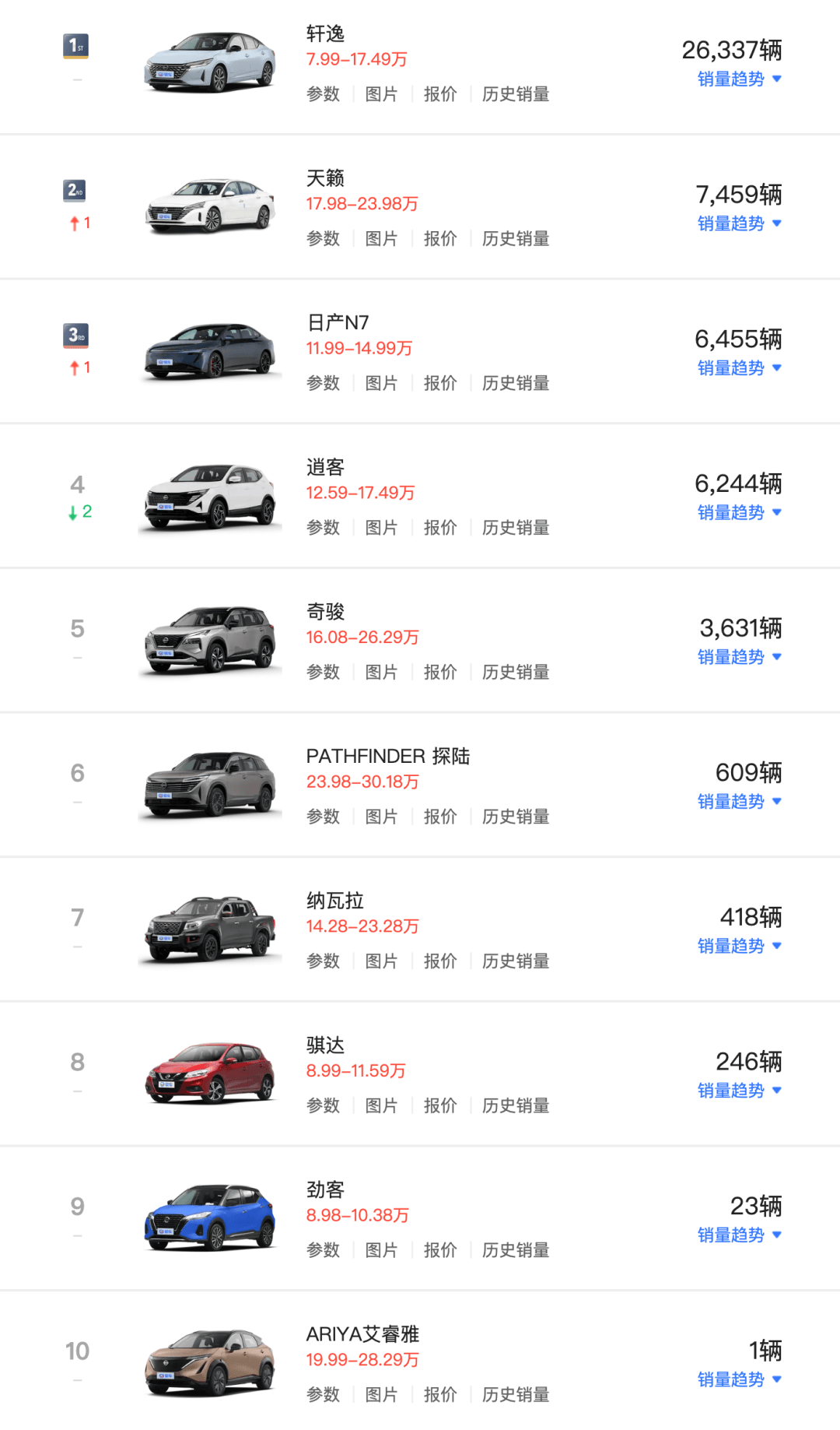 细分车型来看,7月日产汽车在华产品仅有一款车型零售销量过万,轩逸销量为2.63万辆,其它车型销量均低于万辆。其中,进入前五名的天籁、日产N7、逍客、奇骏销量分别为7459辆、6455辆、6244辆、3631辆。