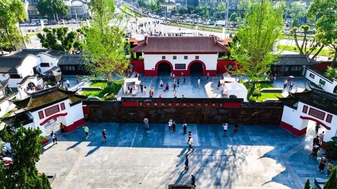 一进景区,望帝杜宇与丛帝鳖灵的庄重石像便映入眼帘,仿佛在诉说古蜀先贤治水兴农的传奇;红墙青瓦的古建筑隐匿在苍翠绿树间,阳光透过枝叶洒下斑驳光影,漫步石板路,每一步都踏在岁月的痕迹里。