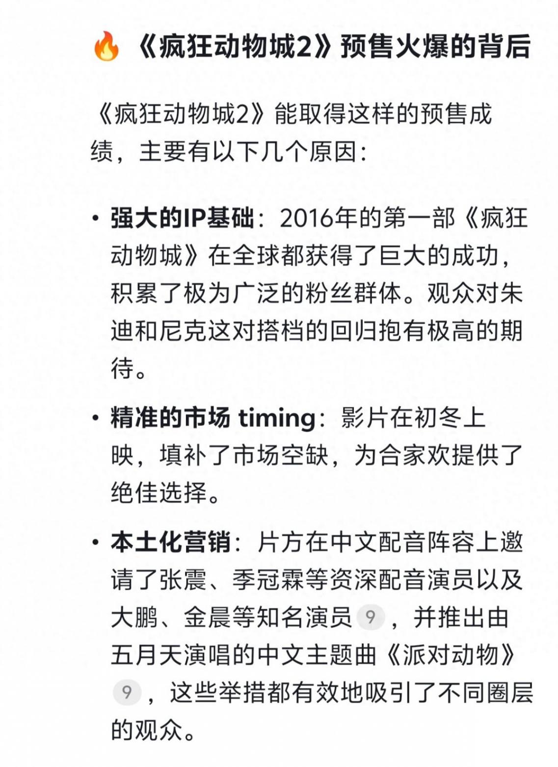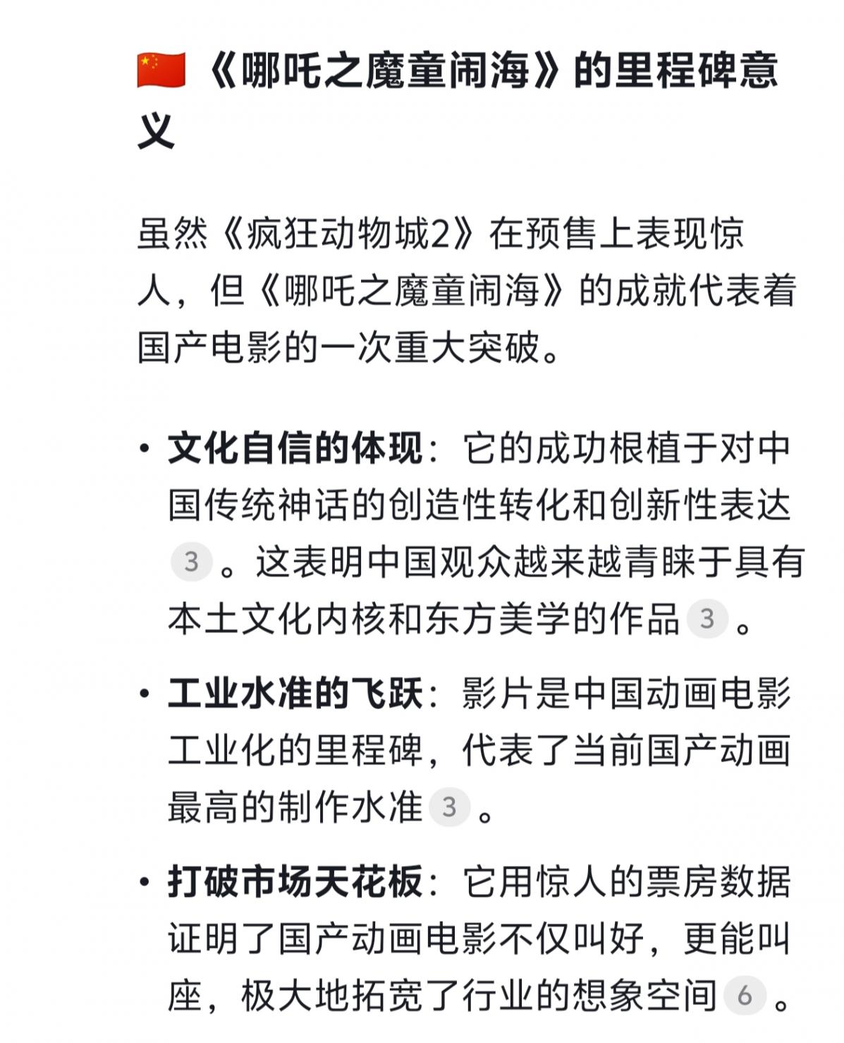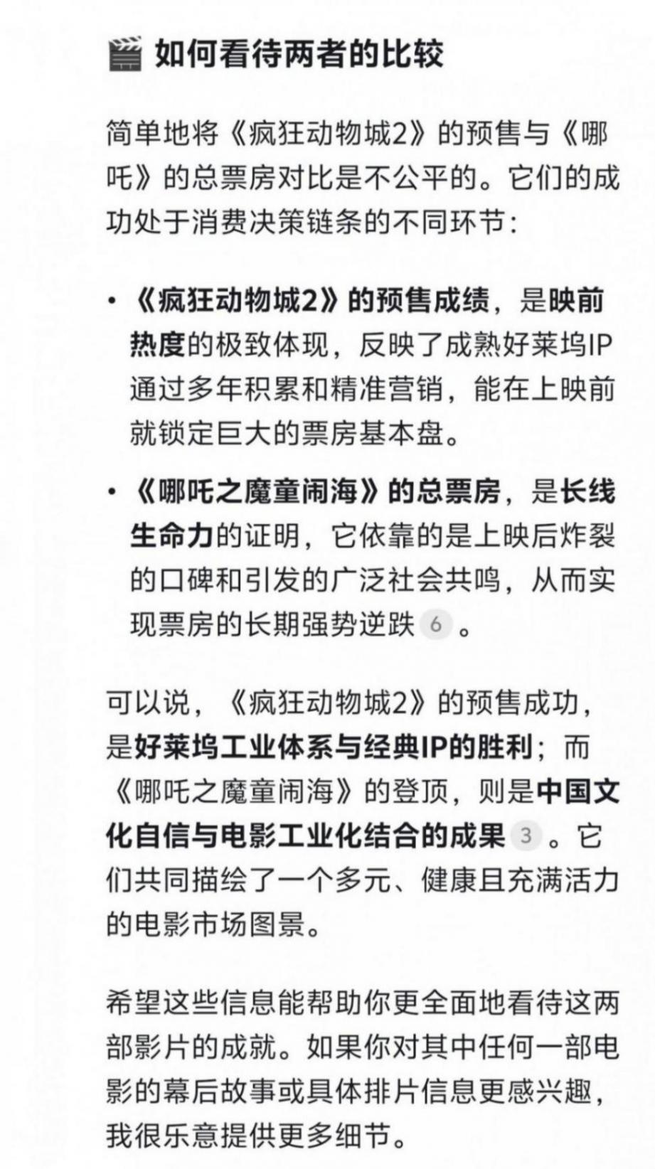 《疯狂动物城2》预售票房突破3亿,确实是一个非常亮眼的成绩,但这需要客观看待:它刷新的是进口动画电影的预售纪录,而《哪吒之魔童闹海》保持的是包含国产片在内的全题材影片的票房总纪录。两者在赛道和意义上有所不同。