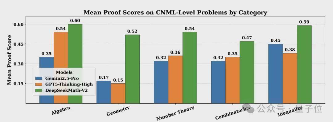 与此同时,DeepSeekMath-V2在所有CNML级别问题类别(代数、几何、数论、组合学、不等式)上均优于GPT-5-Thinking-High和Gemini 2.5-Pro。